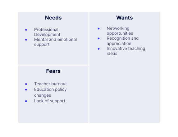 Imagine you are creating a community to support education professionals. Their needs, wants, and fears could be the following: