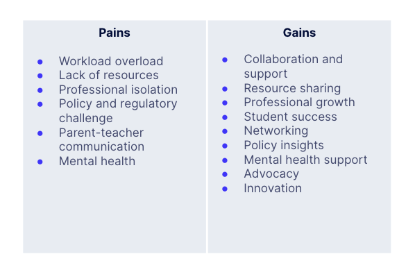 For our community of education professionals, the pains and gains could look like this: