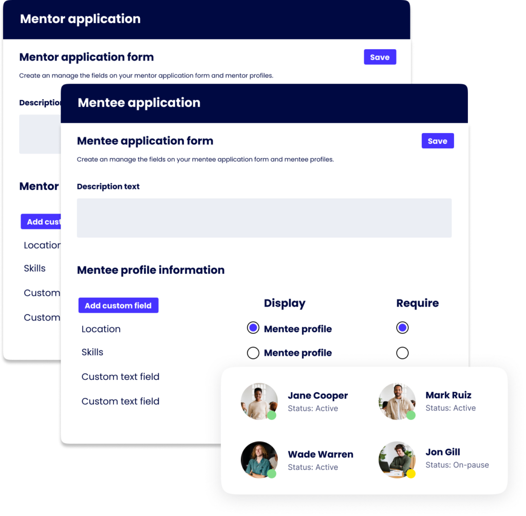 Admins take an active role in curating the mentor-mentee connections. This enables them to ensure high quality matches across the board, adding a layer of personalization beyond simple field matching. Admins can continuously tailor their matching criteria to improve the quality of mentor-mentee relationships.