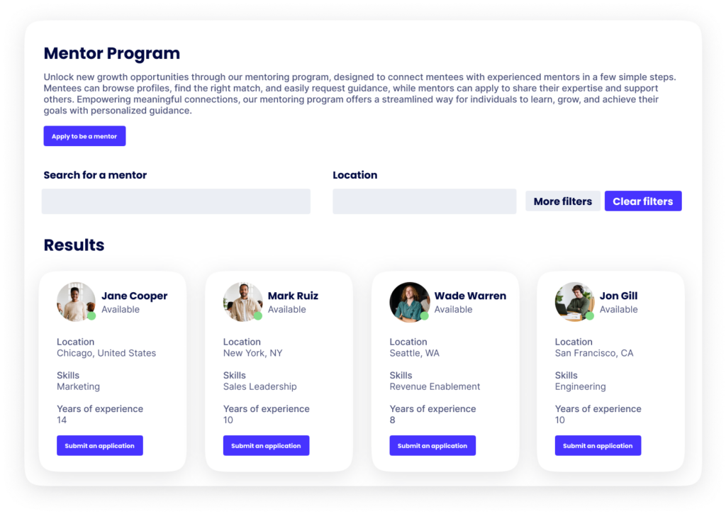 Cultivate organic user connections through a self-selection process that increases buy-in from mentees by making them feel more empowered and invested in their choice of mentor. Admins adopt a more hands-off approach, reducing the time and cost associated with managing the program.